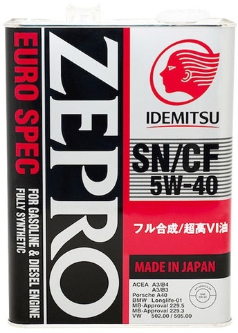 Высококачественное синтетическое моторное масло для четырехтактных форсированных бензиновых и дизельных двигателей легковых автомобилей, микроавтобусов, внедорожников, в том числе с турбонаддувом. Idemitsu Zepro EURO SPEC SN/CF 5W-40 произведен на основе синтетического базового масла с использованием запатентованной технологии Idemitsu Kosan Co., Ltd. Данный продукт обладает высокими моющими свойствами, превосходными смазывающими характеристиками при высоких температурах и малым сопротивлением к проворачиванию коленчатого вала двигателя, в условиях низкотемпературного пуска. Idemitsu Zepro EURO SPEC SN/CF 5W-40 обеспечивает надёжную защиту современных двигателей и значительно продлевает ресурс каталитического нейтрализатора и сажевого фильтра легковых автомобилей, микроавтобусов и внедорожников.